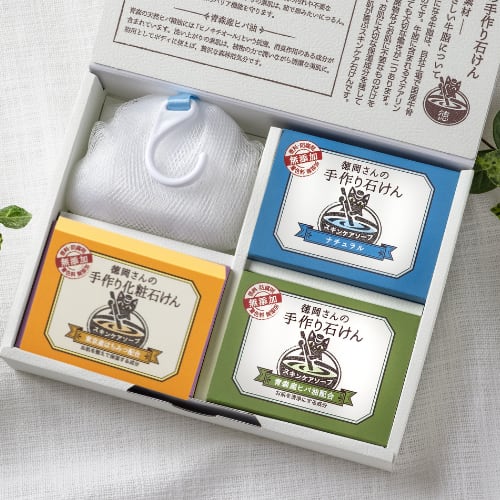 3種類の化粧石けんと濃密泡立てネットをセットにしました。